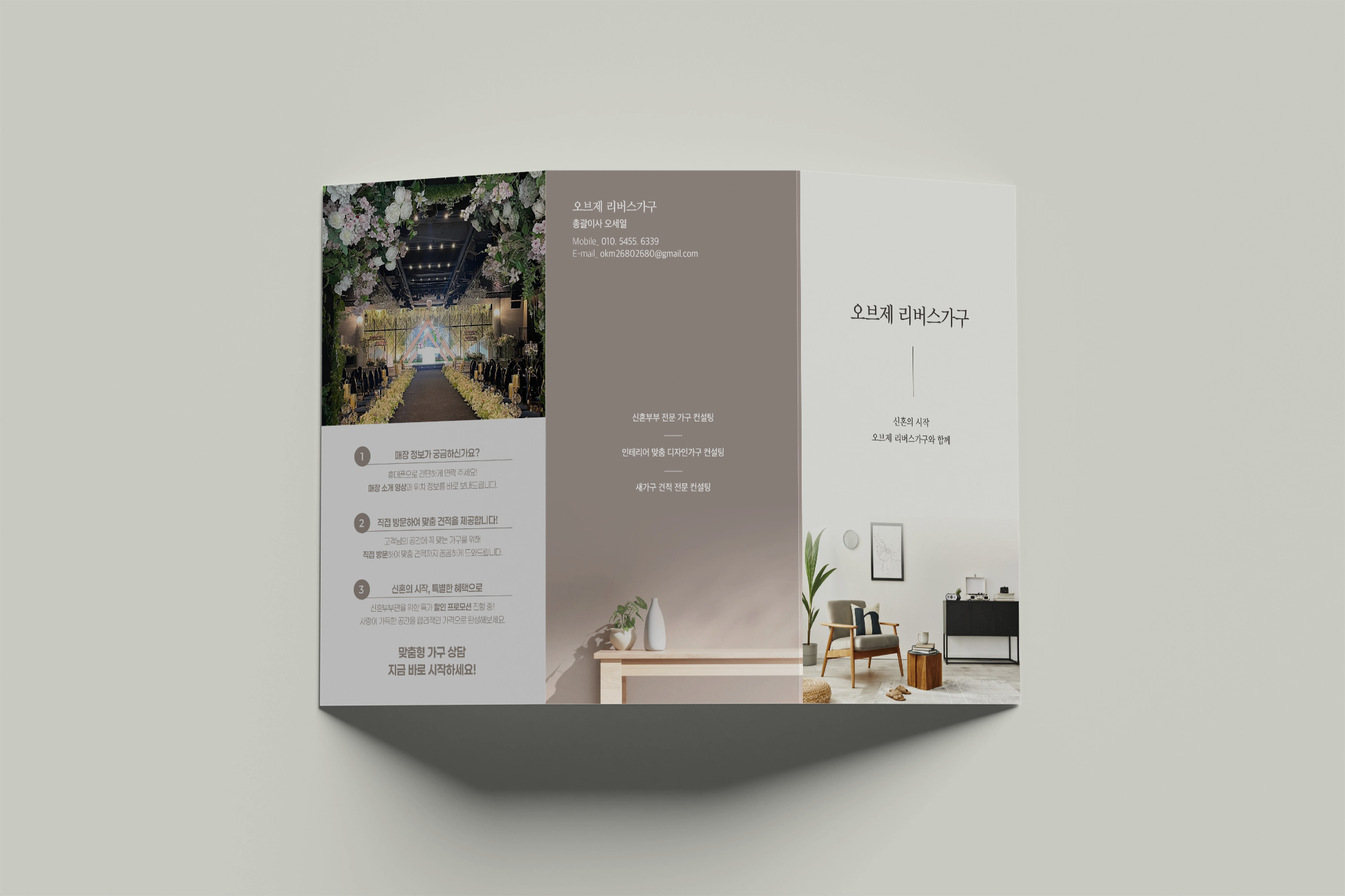 앞면에는 브랜드 소개와 웨딩홀 느낌의